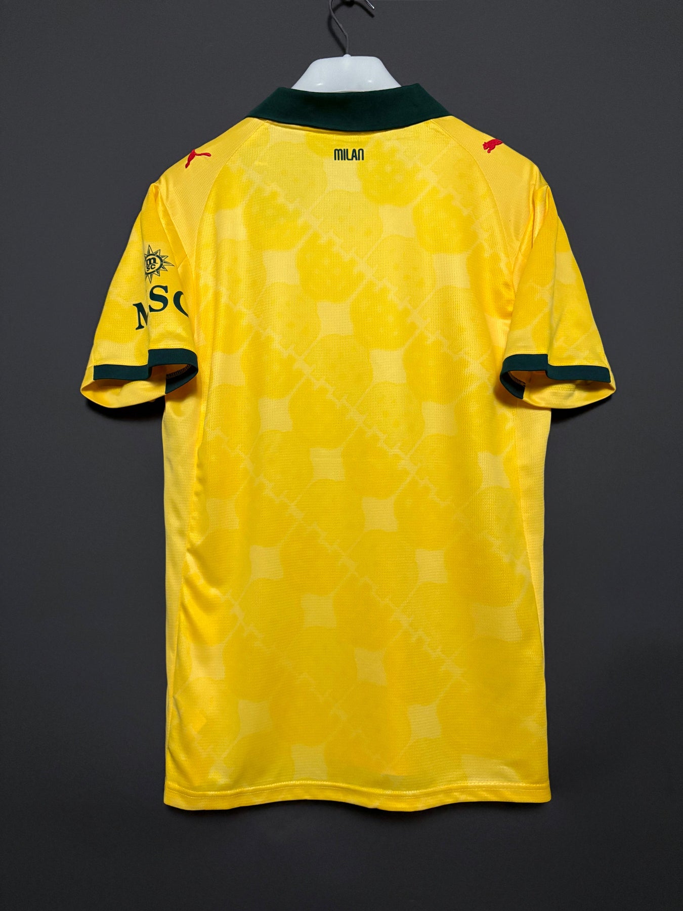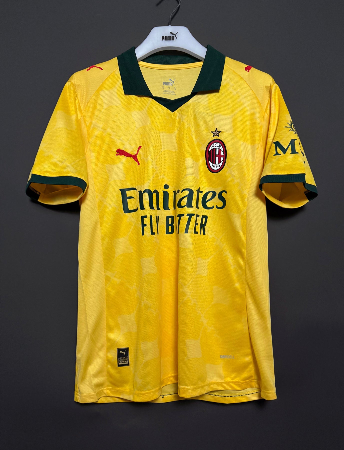 AC Milanin kolmannessa pelipaidassa on moderni vaaleanharmaa design, jota elävöittää koko kankaan kattava dynaaminen kuviointi. Sivujen punaiset ja mustat yksityiskohdat luovat selkeän yhteyden seuran perinteisiin väreihin ja muodostavat voimakkaan kontrastin. Rintaan sijoitettu seuran tunnus ja sponsoripainatus viimeistelevät modernin ilmeen. Paita on valmistettu kevyestä ja hengittävästä teknisestä materiaalista, joka tarjoaa optimaalisen käyttömukavuuden niin otteluiden aikana kuin arjessakin.