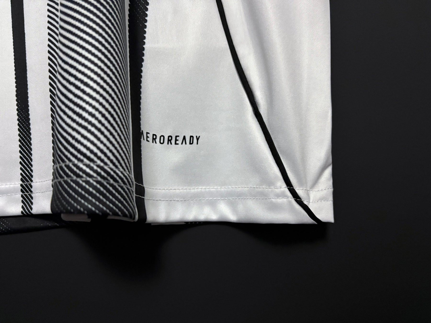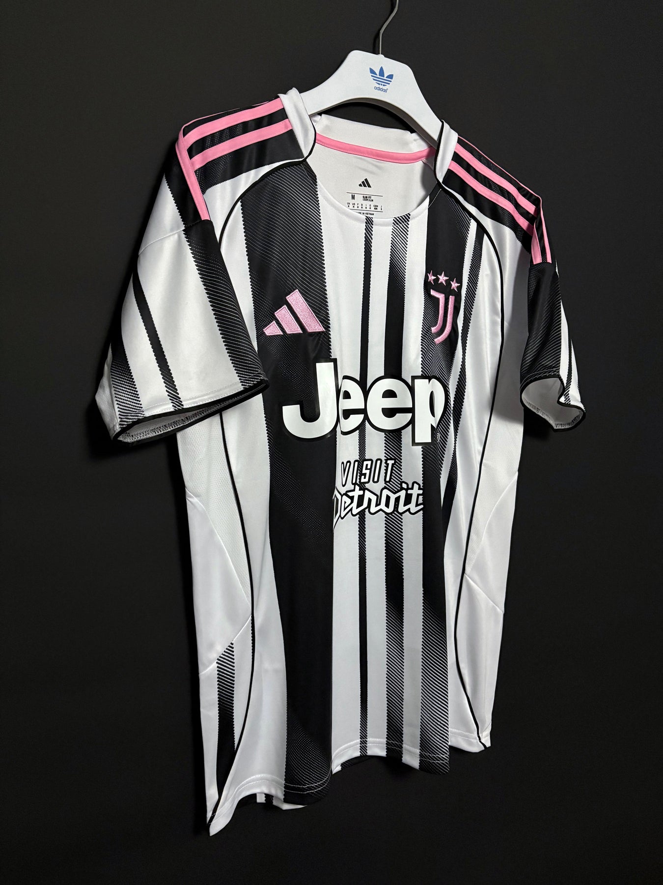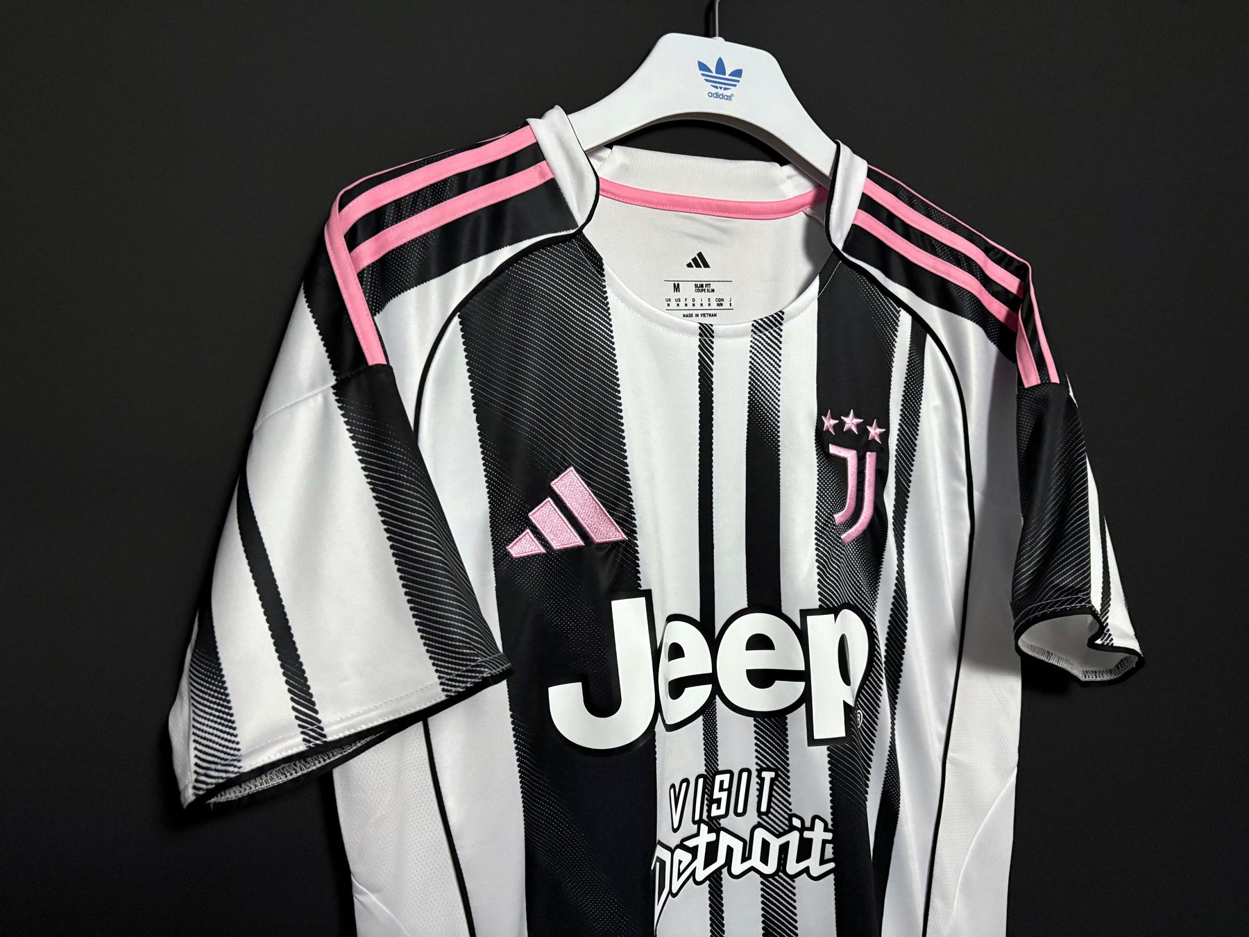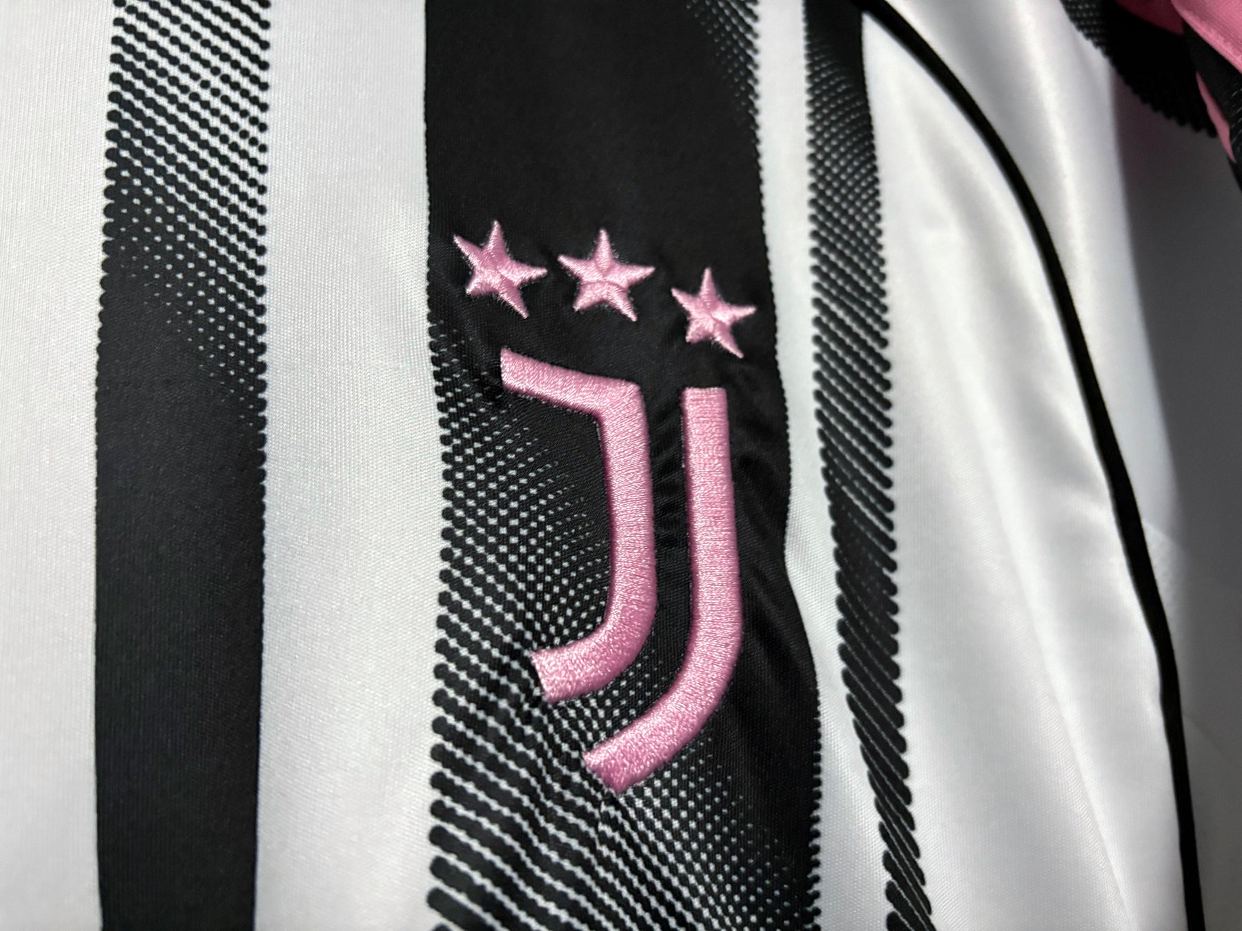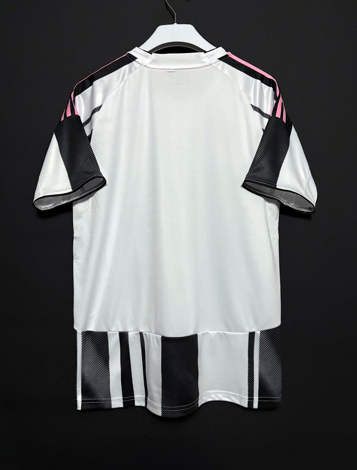 Juventuksen kotipelipaidassa on klassinen mustavalkoinen design, jota täydentävät modernit yksityiskohdat luoden voimakkaan ja tyylikkään ilmeen. Pystysuuntaiset raidat yhdistyvät hienovaraisiin vaaleanpunaisiin tehosteisiin, jotka luovat ainutlaatuisen kontrastin ja antavat paidalle nykyaikaisen ilmeen. Paita on valmistettu kevyestä ja hengittävästä materiaalista, joka tarjoaa erinomaisen käyttömukavuuden niin otteluiden aikana kuin arjessakin.