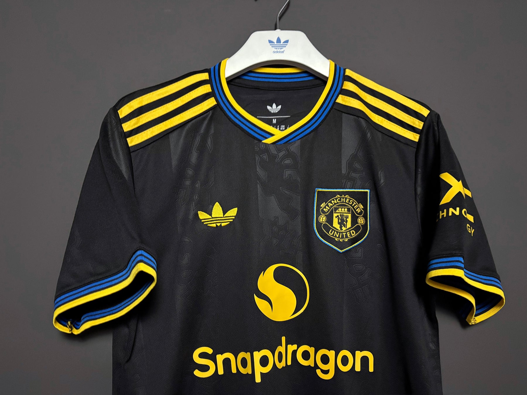 Manchester Unitedin kolmannessa pelipaidassa on tyylikäs musta design, jota täydentävät hienovaraiset sävy sävyyn -kuviot luoden modernin ja eksklusiivisen ilmeen. Keltaiset yksityiskohdat ja olkapäiden raidat muodostavat voimakkaan kontrastin ja antavat paidalle energisen ja urheilullisen ulkoasun. Seuran logo ja sponsoripainatus keltaisena korostavat sen erottuvaa tyyliä. Paita on valmistettu kevyestä ja hengittävästä materiaalista, joka tarjoaa erinomaisen käyttömukavuuden niin otteluiden aikana kuin arjessakin.